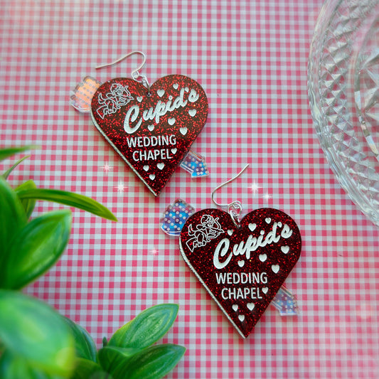 Cupid’s Chapel Hearts Handmade Acrylic Dangle Earrings & Keychains